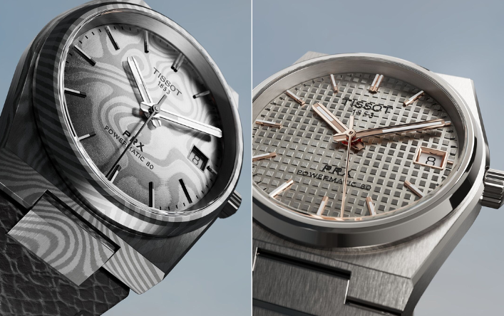 ディープブルーの文字盤にニッケル仕上げのバトン針とアプライドインデックスを組み合わせたモデルと、チタニウムそのものに敬意を表したグレーの文字盤に、対照的なローズゴールドの針とインデックスを配したモデルの2種類が登場します。いずれもPRX パワーマティック 80の象徴的な要素であるワッフルパターンの文字盤を備え、コレクションの大胆でモダンなスピリットを強調しながら、優れた視認性を確保しています。