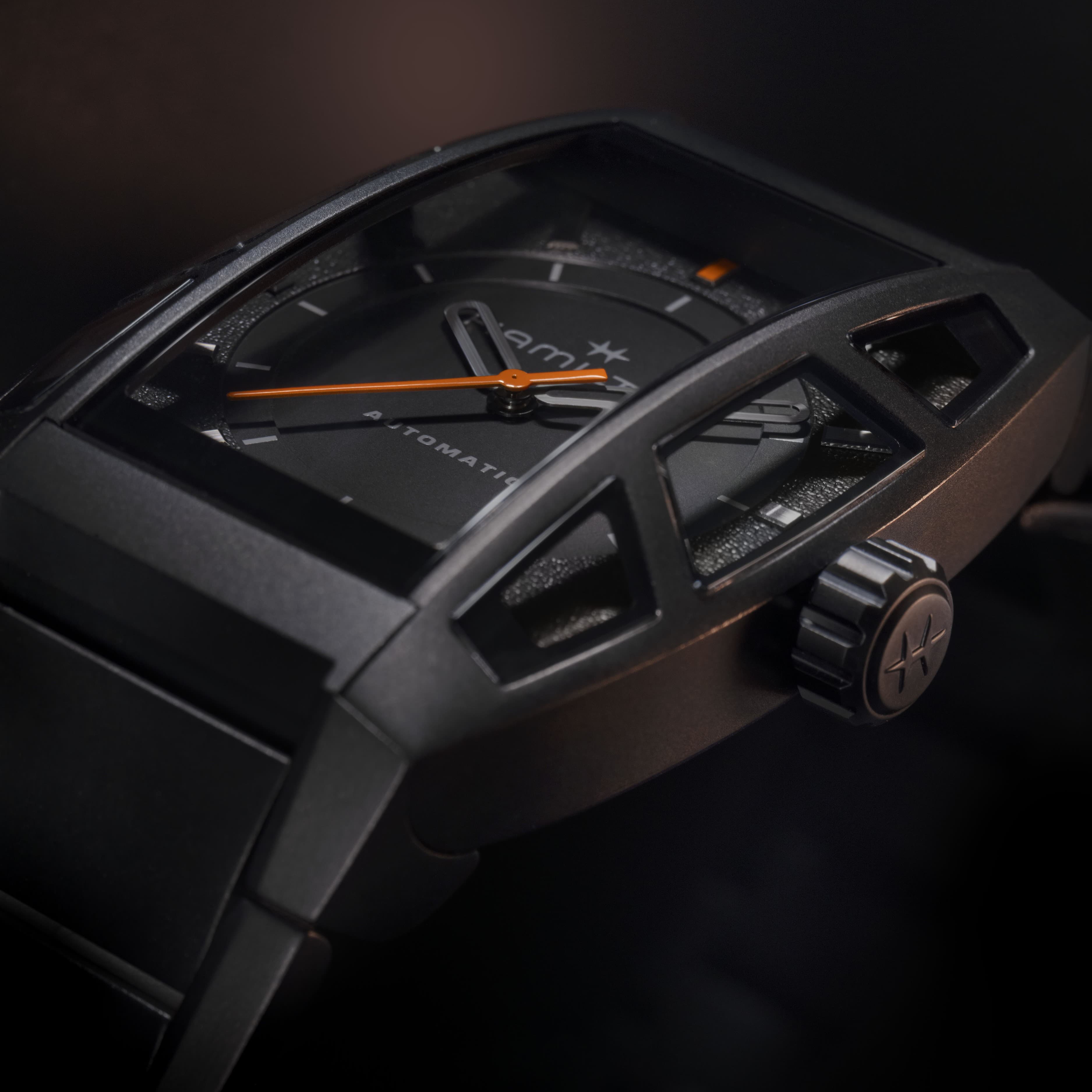 ブラックPVD加工を施したチタニウム製ケースは、ハミルトンの名作「ボルトン」に着想を得た滑らかなアーチ状のラインを描き、軽量かつ高耐久を実現。7つのサファイアクリスタルが生み出す光と影の屈折が、時間の流れとともに表情を変えていきます。ミニマルなグレーのインジケーターに、オレンジの秒針と12時位置のアクセントが映え、ループ状の針がフェイスに軽やかさを添えます。ムーブメントには80時間のパワーリザーブを誇る自動巻き機構を搭載し、ニヴァクロン™製ヒゲゼンマイが磁場や衝撃への耐性を強化。ケースバックにはシリアルナンバーが刻まれ、ゲームの物語にインスパイアされた特製パッケージとクロスが付属する、世界限定2,000本の特別なモデルです。