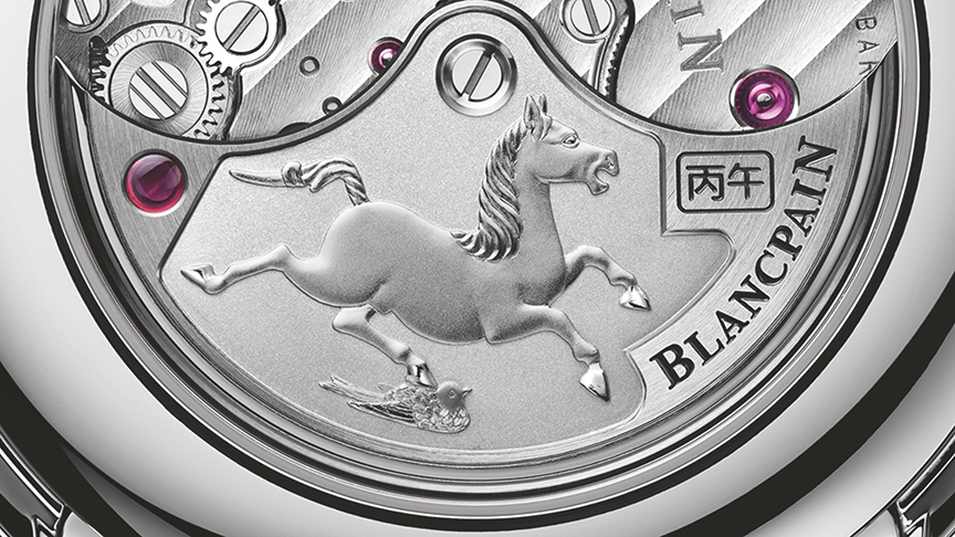 サファイアのケースバックからは、メティエダールアトリエが手がけた22Kゴールド製ローターを望めます。疾走する馬が飛翔するツバメの上を進む意匠は、中国王朝の伝説に語られる天馬を想起させ、天然ルビーと「午」「丙」の漢字が象徴的なアクセントを添えます。芸術性と機能美が融け合うその仕上げは、カレンダー機構におけるメゾンの究極の到達点を物語ります。