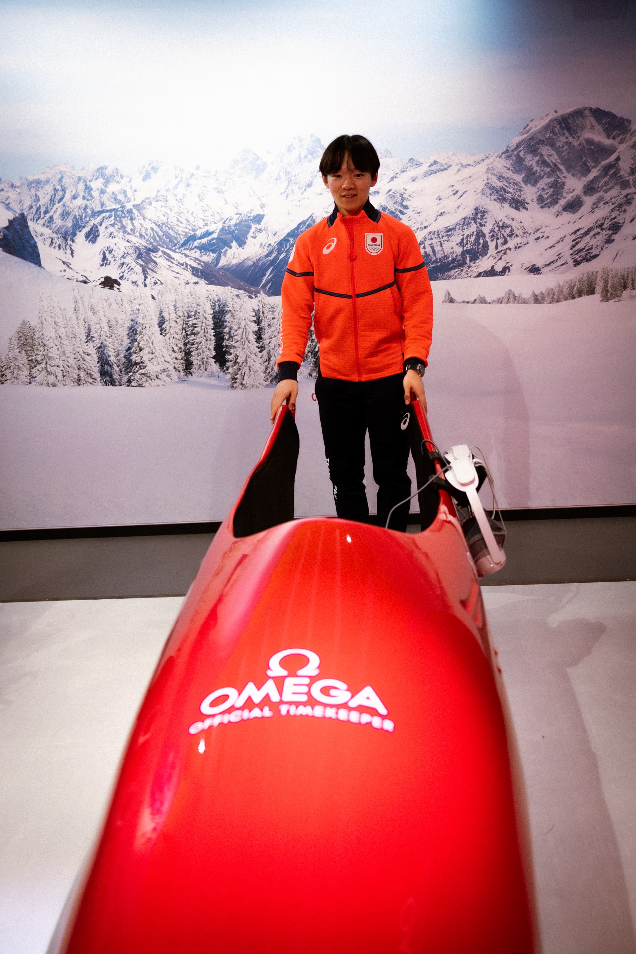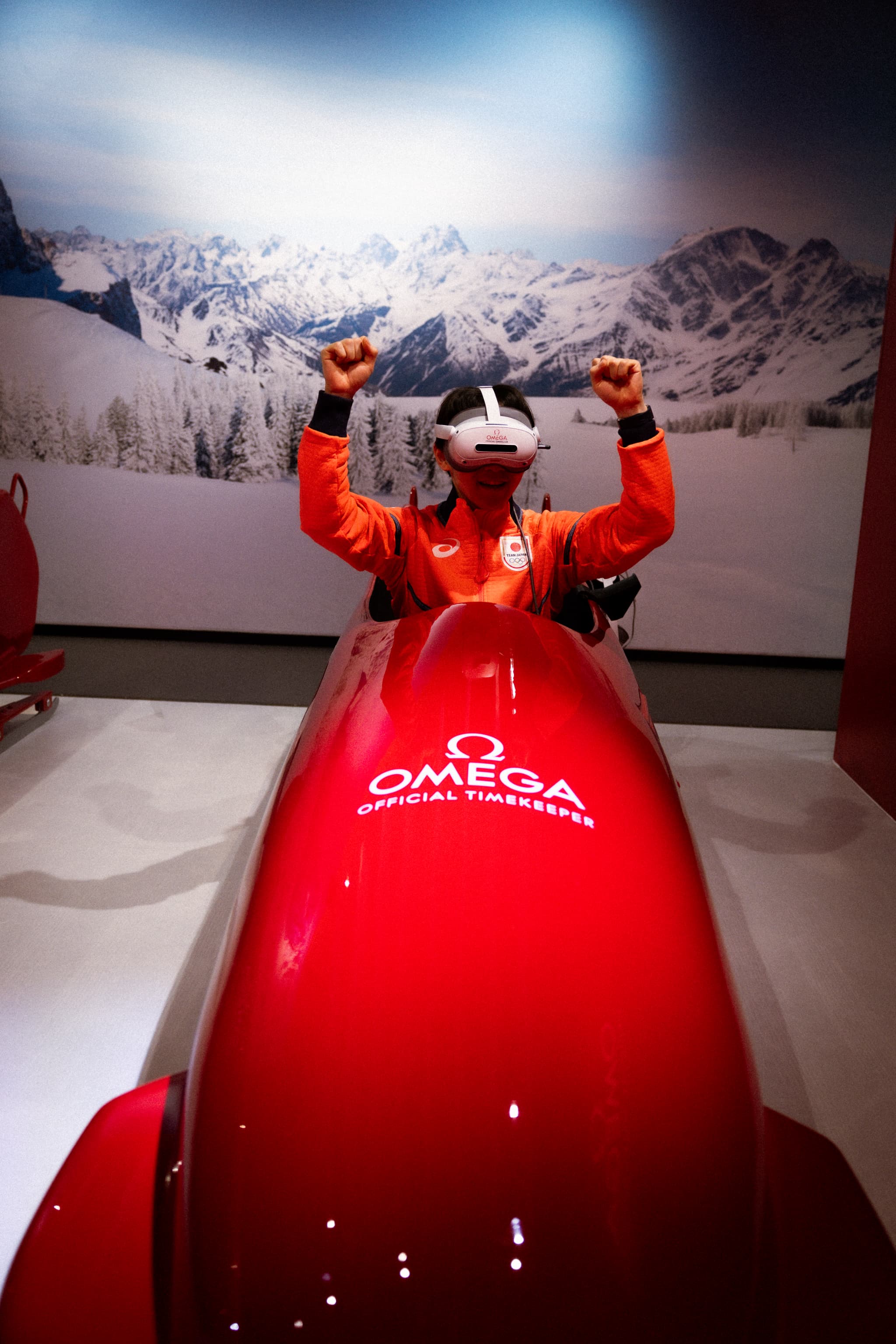 また鍵山選手は、パビリオン内にある実際のボブスレーに乗り込み、VR 体験を初トライ。「VR 体験は初めてで、こんなにリアルに再現されて驚きました!風を感じ、スピード感や動きまで感じたのに、動いてないんですか?!」と、ボブスレーならではのスピードと迫力、そしてオメガの計時技術がいかにしてわずかな瞬間も計測しているかを体感しました。