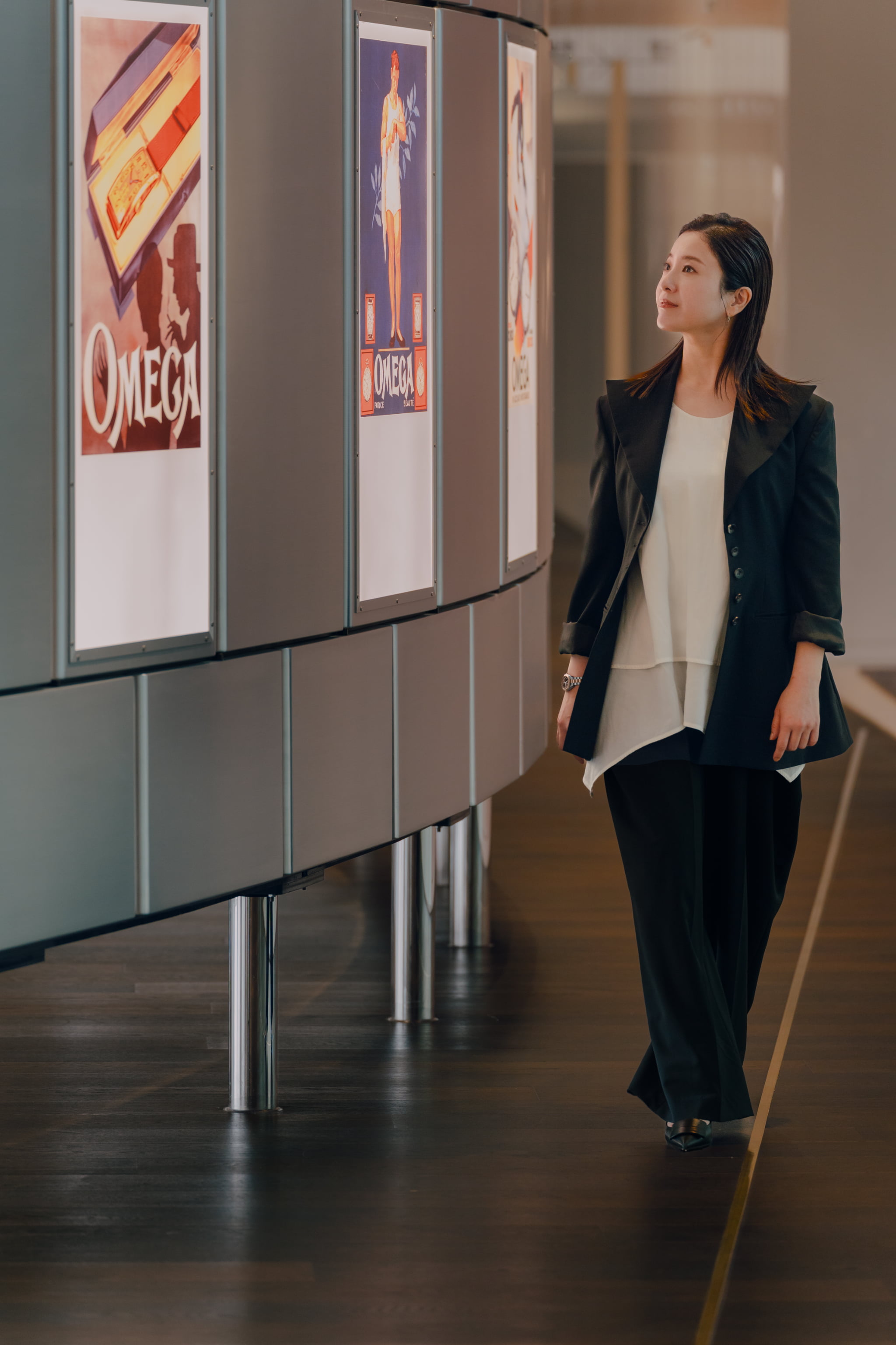 最初に訪れたオメガ ミュージアムには、長い歴史における数々の功績や物語が展示されています。 中でも印象的な “オリンピックエリア”では、オフィシャルタイムキーパーとしての歩みを象徴する 最先端の計時機器が紹介されており、吉高由里子は全長 9m のランニングトラックに設置された スターティングブロックに足をセットし、実際に走ることでオメガの“計時”を体験しました。また “月面エリア”では、アポロ 11 号の月面着陸や 13 号における 14 秒の危機を救った「スピードマス ター ムーンウォッチ」に触れ、歴史的瞬間に寄り添ってきたオメガの存在感を実感。さらには、 レディースウォッチのアーカイブピースを通じて、これまでメンズのイメージが強かったオメガに おける、レディースウォッチメイキングの歴史についても理解を深めました。