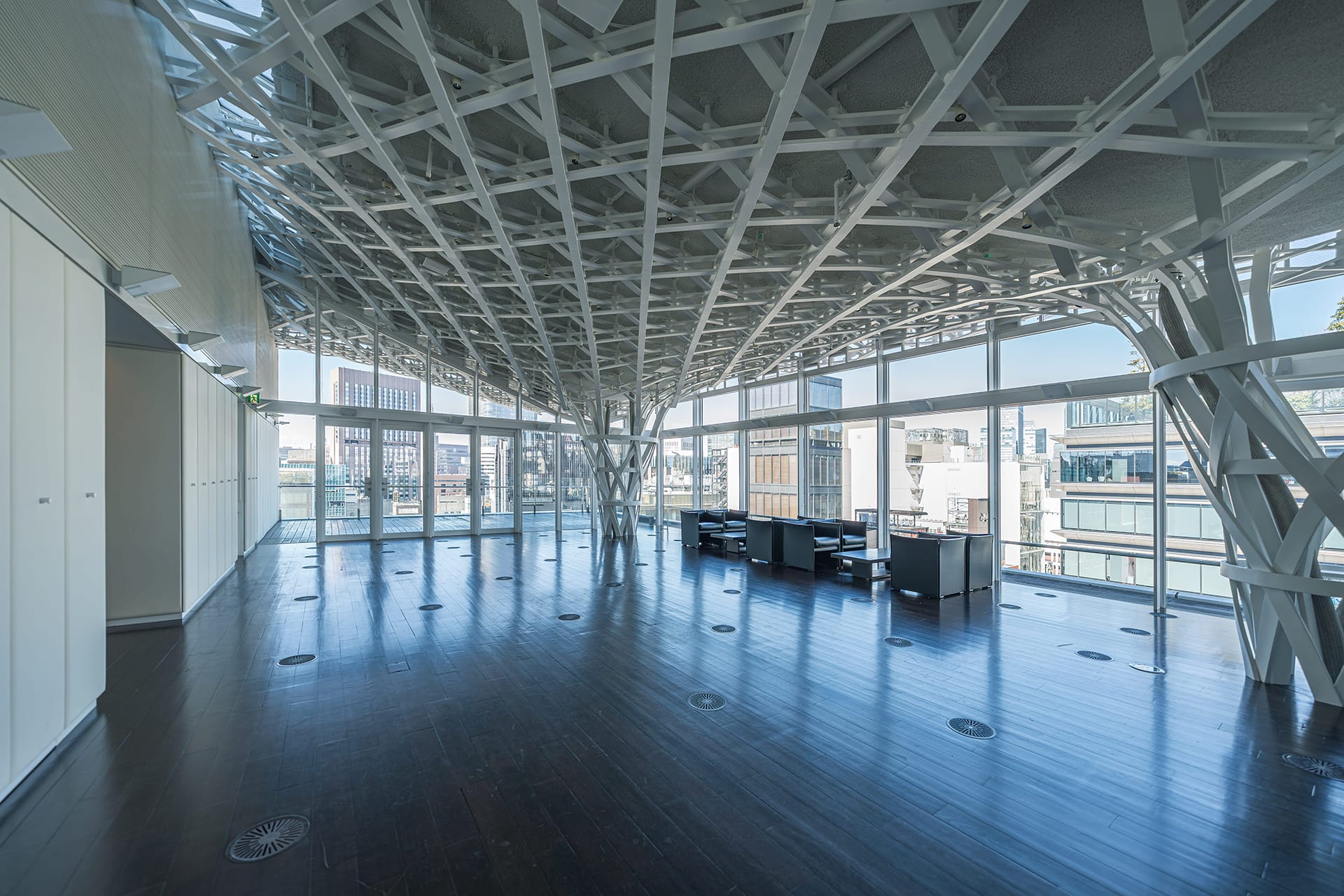 時の都を意味する「シテ・ドゥ・タンギンザ」は、三面ガラス張りと解放可能なテラスから銀座の街並みを一望できるイベントスペースです。日中は豊かな自然光が注ぎ込み解放感あふれるこの空間は、夜には華やかな銀座の夜景を眺望できる空間へと一変します。