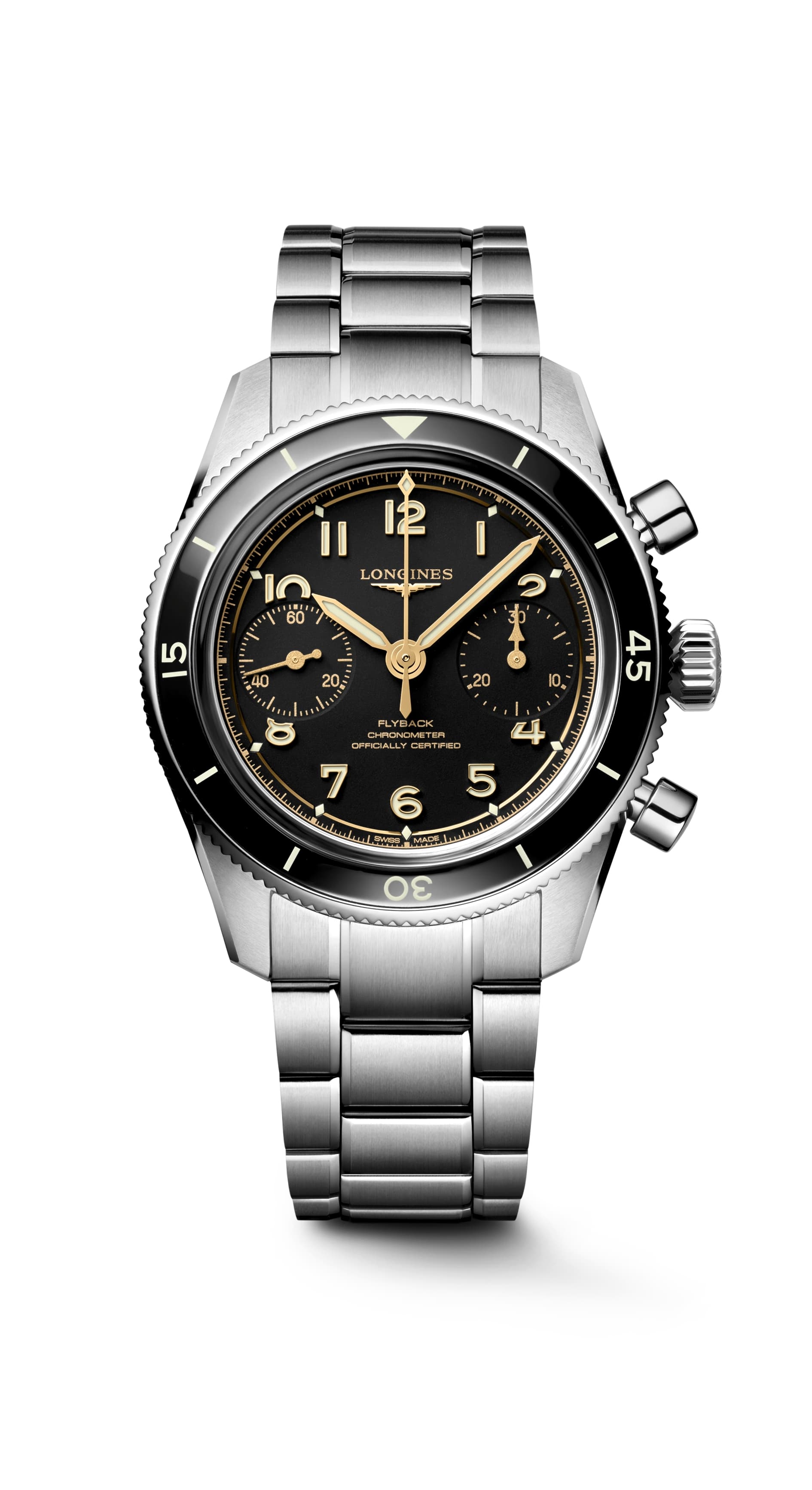 「ロンジン スピリット パイロット」コレクションの核に位置する「スピリット パイロット フライバック」。この洗練されたパイロットウォッチは、1930年代初頭に初のフライバック機能搭載のクロノグラフウォッチを製造し、1935年に特許を申請したという、ロンジンのクロノグラフ、フライバックの開発における先駆的な役割を物語ります。