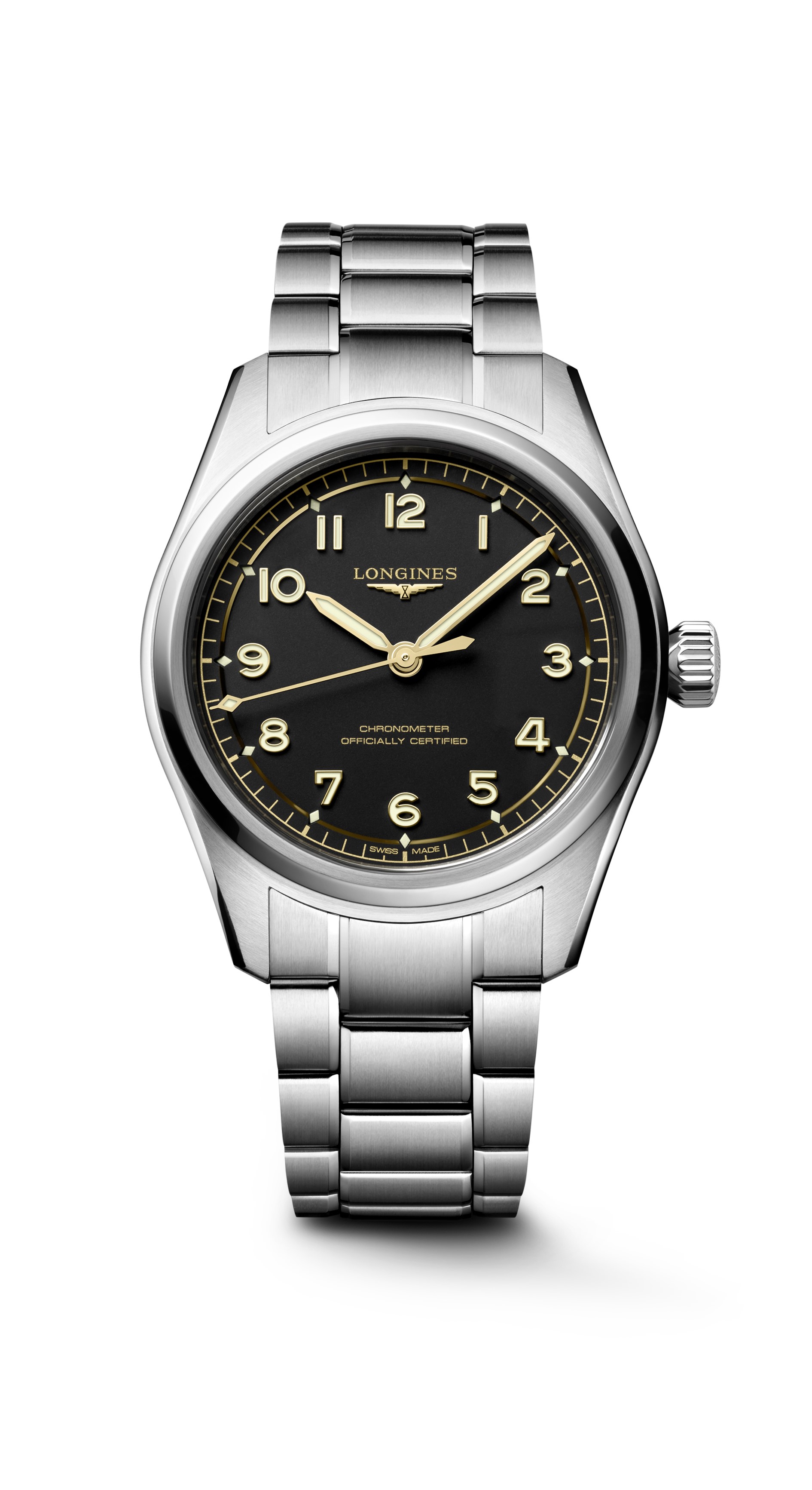 「ロンジン スピリット パイロット」は、「ロンジン スピリット」コレクションのルーツである航空技術を忠実に再現した流線型の3針モデルです。人間工学に基づき再設計された39mmのステンレススティール製ケースを備え、着け心地と見た目の美しさを向上させています。クリーンなマットブラックの文字盤で純粋な機能性を追求。オリジナルの「スピリット」3針モデルにあった5つ星と日付表示をとり、ミニッツトラックをより明瞭にしました。 ゴールドカラーの針とアプライドのアラビア数字が印象的なコントラストを生み出し、あらゆるコンディションでの視認性を実現するとともに、この時計にヴィンテージの魅力を与えています。