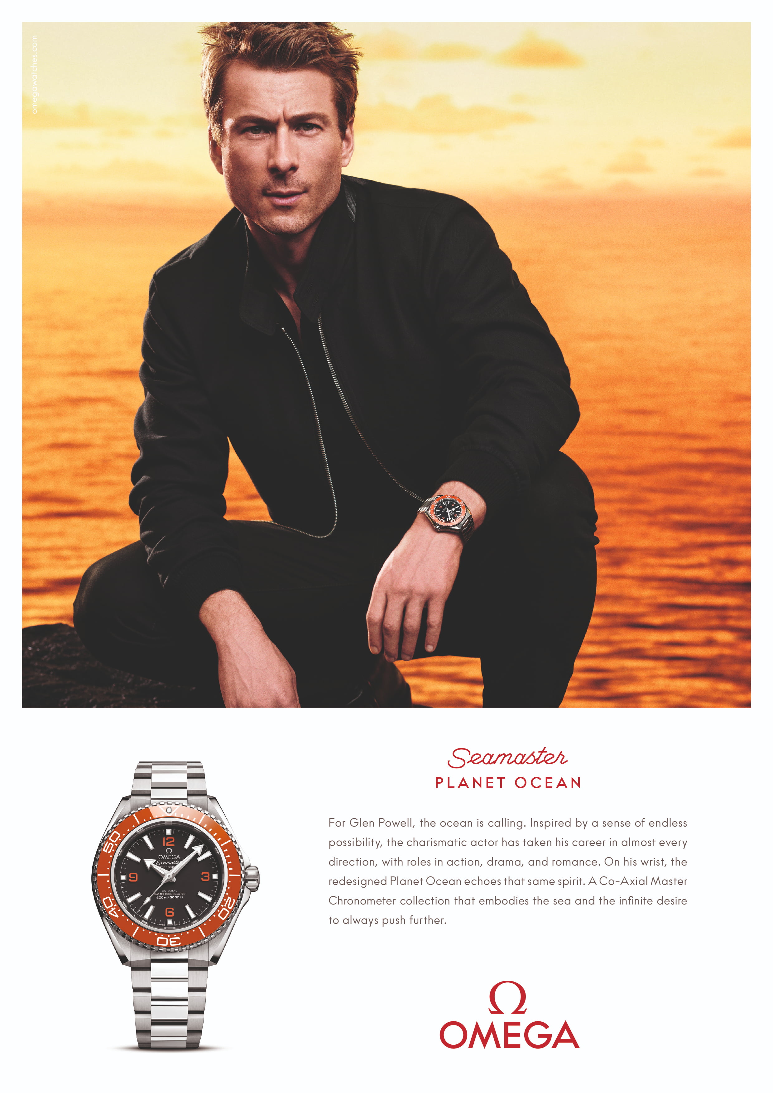 グレン・パウエルもスクリーン上で多彩な魅力を放ってきた役者です。アクション、ドラマ、ロマンスなど、バラエティに富んだ役柄に独自のカリスマ性をもたらし、ほとばしるエネルギーと無限とも思える演技の幅を体現しています。キャンペーンでは、ダイビングとの伝統を象徴するシグネチャーカラー、オレンジの新作を着用し、「海と本物のつながりを打ち出せる時計ブランドはそう多くありませんが、そういう意味でオメガは貴重なブランドです。新作を腕に着けた瞬間、その確かな存在感を実感できました。」と語りました。