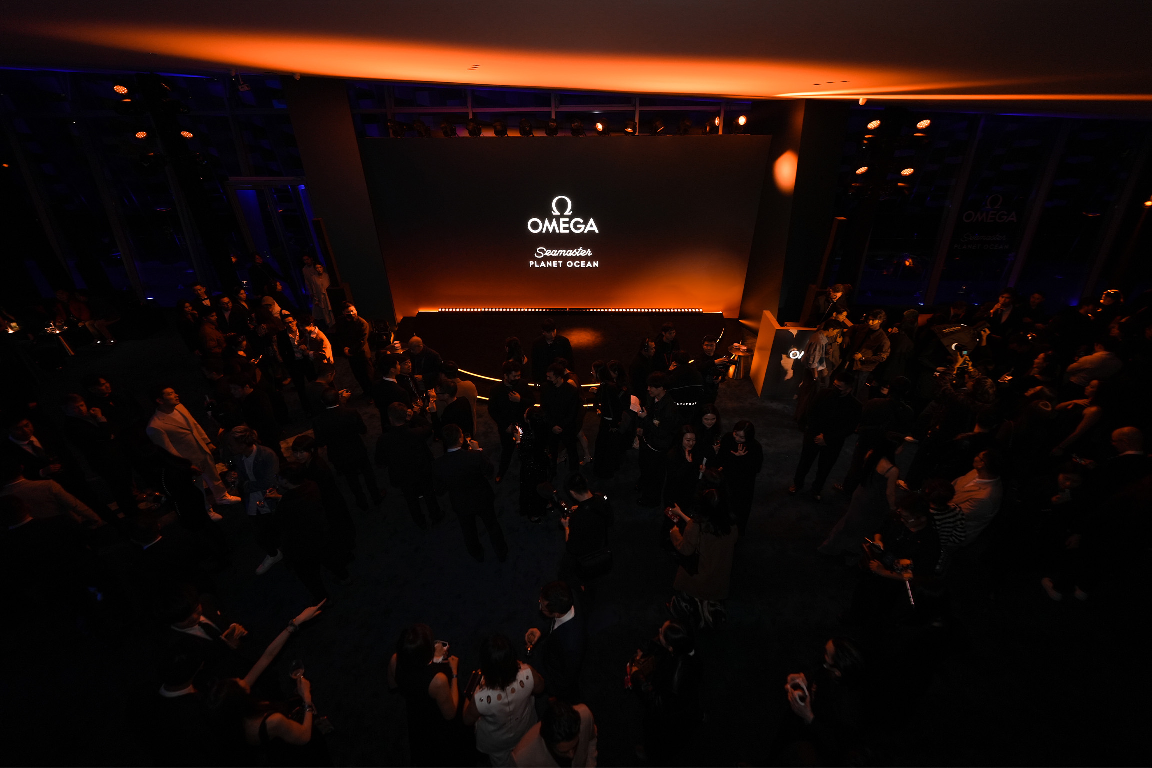 イベントの幕開けとともに、黄金の陽光が水面を照らし、オメガのシグネチャーカラーであるオレンジの光が会場を包み込みました。夜の深まりとともに空間は鮮烈な光に照らされ、海洋を思わせるダイナミックな雰囲気を演出。この光と色の調和は、新作のカラーテーマを象徴し、オメガが培ってきた海洋探査へのオマージュとなりました。ゲストは、会場中央に一堂した最新モデルを鑑賞しながら、オメガのダイバーズウォッチの革新とパイオニアとして築き上げてきた歴史を間近で体感しました。
