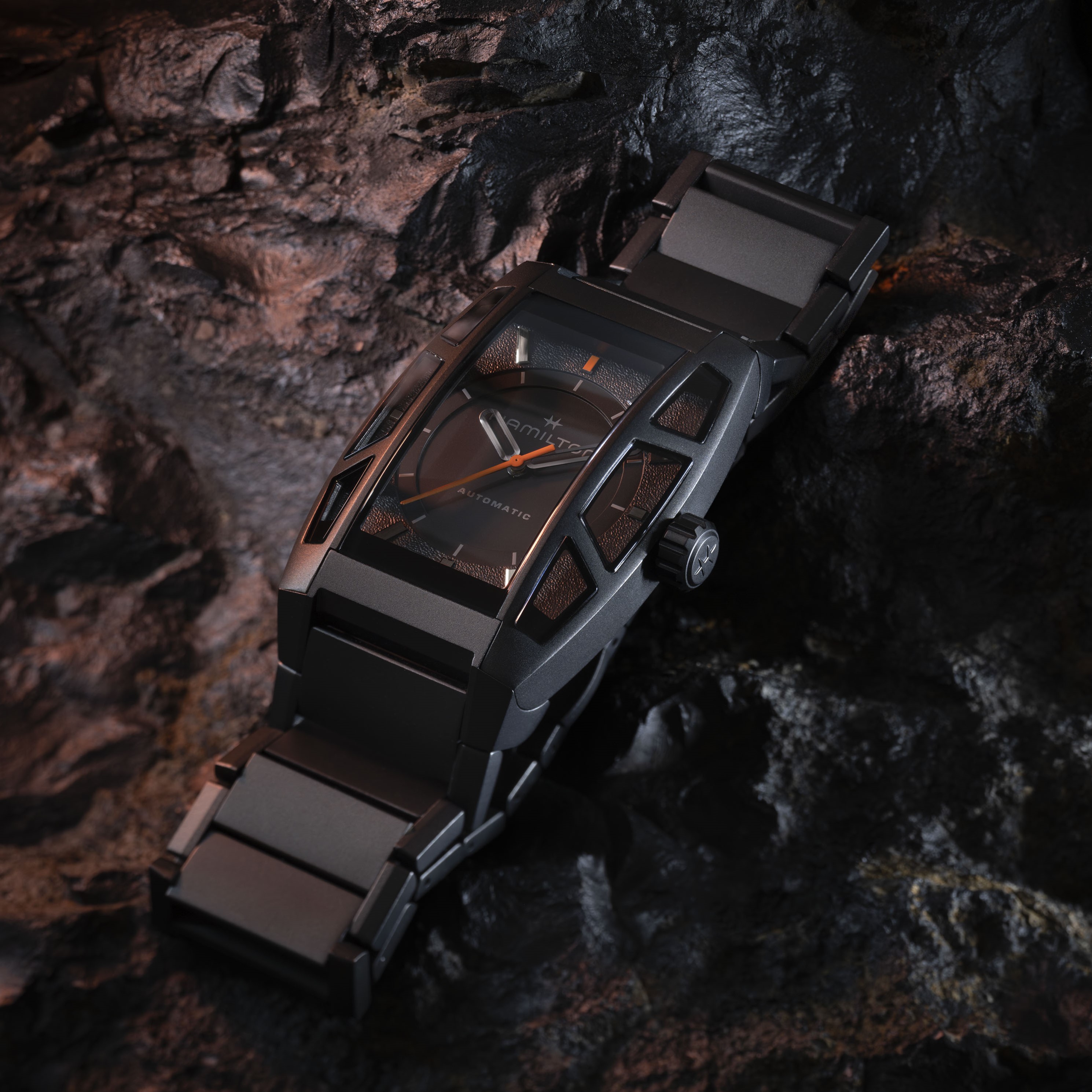 ブラックPVD加工を施したチタニウム製ケースは、ハミルトンの名作「ボルトン」に着想を得た滑らかなアーチ状のラインを描き、軽量かつ高耐久を実現。7つのサファイアクリスタルが生み出す光と影の屈折が、時間の流れとともに表情を変えていきます。ミニマルなグレーのインジケーターに、オレンジの秒針と12時位置のアクセントが映え、ループ状の針がフェイスに軽やかさを添えます。ムーブメントには80時間のパワーリザーブを誇る自動巻き機構を搭載し、ニヴァクロン™製ヒゲゼンマイが磁場や衝撃への耐性を強化。ケースバックにはシリアルナンバーが刻まれ、ゲームの物語にインスパイアされた特製パッケージとクロスが付属する、世界限定2,000本の特別なモデルです。