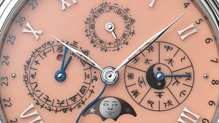 表示は極めて直感的で、12時位置に中国の伝統的な2時間刻み(ダブルアワー)と十二支、3時位置に五行と陰陽、6時位置にメゾンの象徴的なムーンフェイズ、9時位置に中国太陰暦の日付と月(閏月を含む)をそれぞれ備えます。ダイヤル外周にはグレゴリオ暦の日付スケールを配し、伝統的なブルーのサーペント針がそれを指し示します。