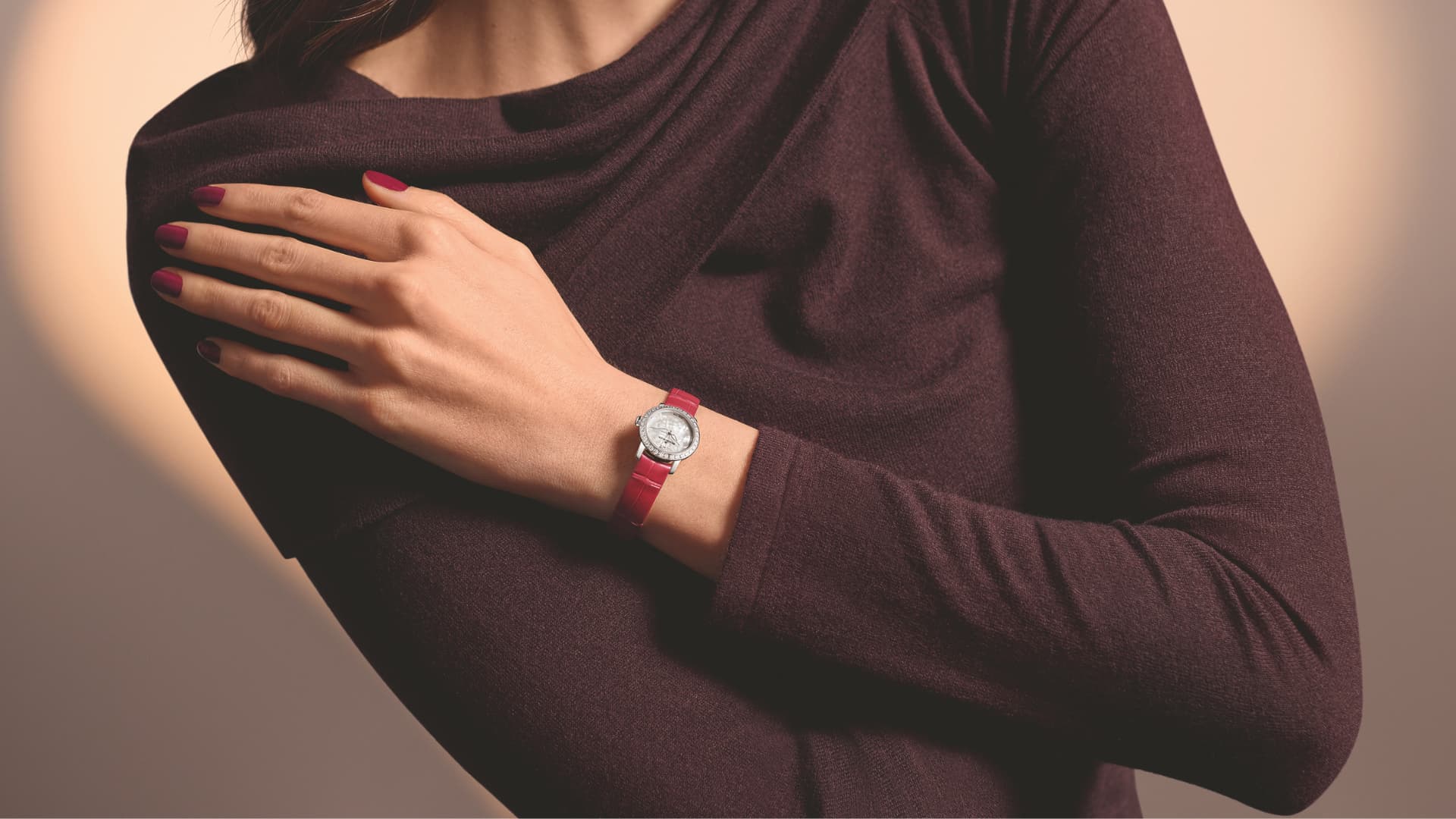 情熱を象徴する「シェリーレッド」のアリゲーターレザーストラップを合わせた本作は、バレンタインデーにふさわしい特別なエレガンスを放ちます。限定本数は わずか14本。特別な日に贈る希少な高級時計として唯一無二の存在です