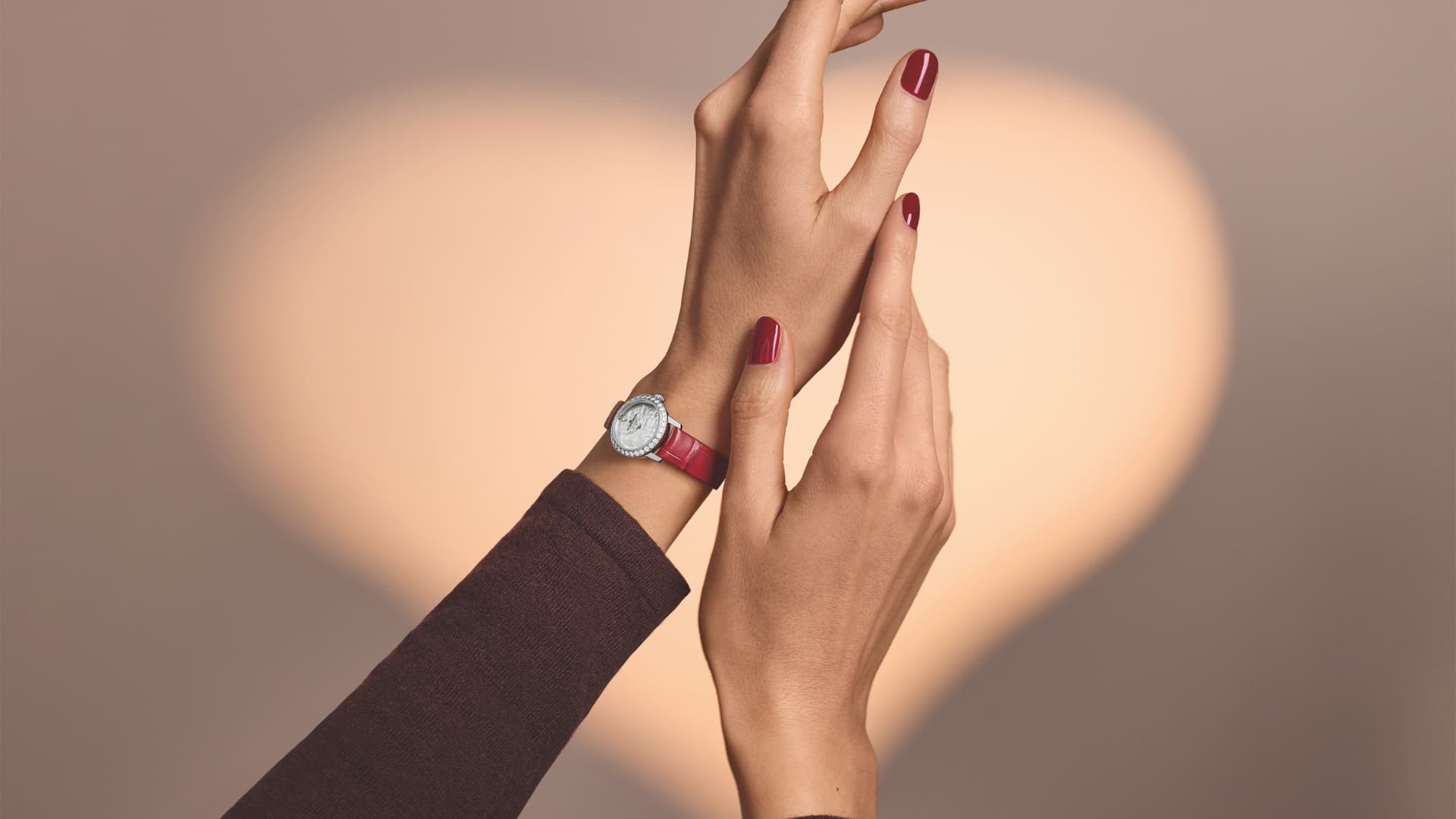ケース内部には、直径わずか15.70mmの自動巻ムーブメント、自社製キャリバー615を搭載。シリコン製ヒゲゼンマイを採用し、精度や耐磁性を高めつつ、38時間のパワーリザーブを確保しています。ケースバックのサファイアクリスタル越しには、ハートの装飾が施されたローターが見え、細部に至るまでバレンタインらしい遊び心と美しさが込められています。