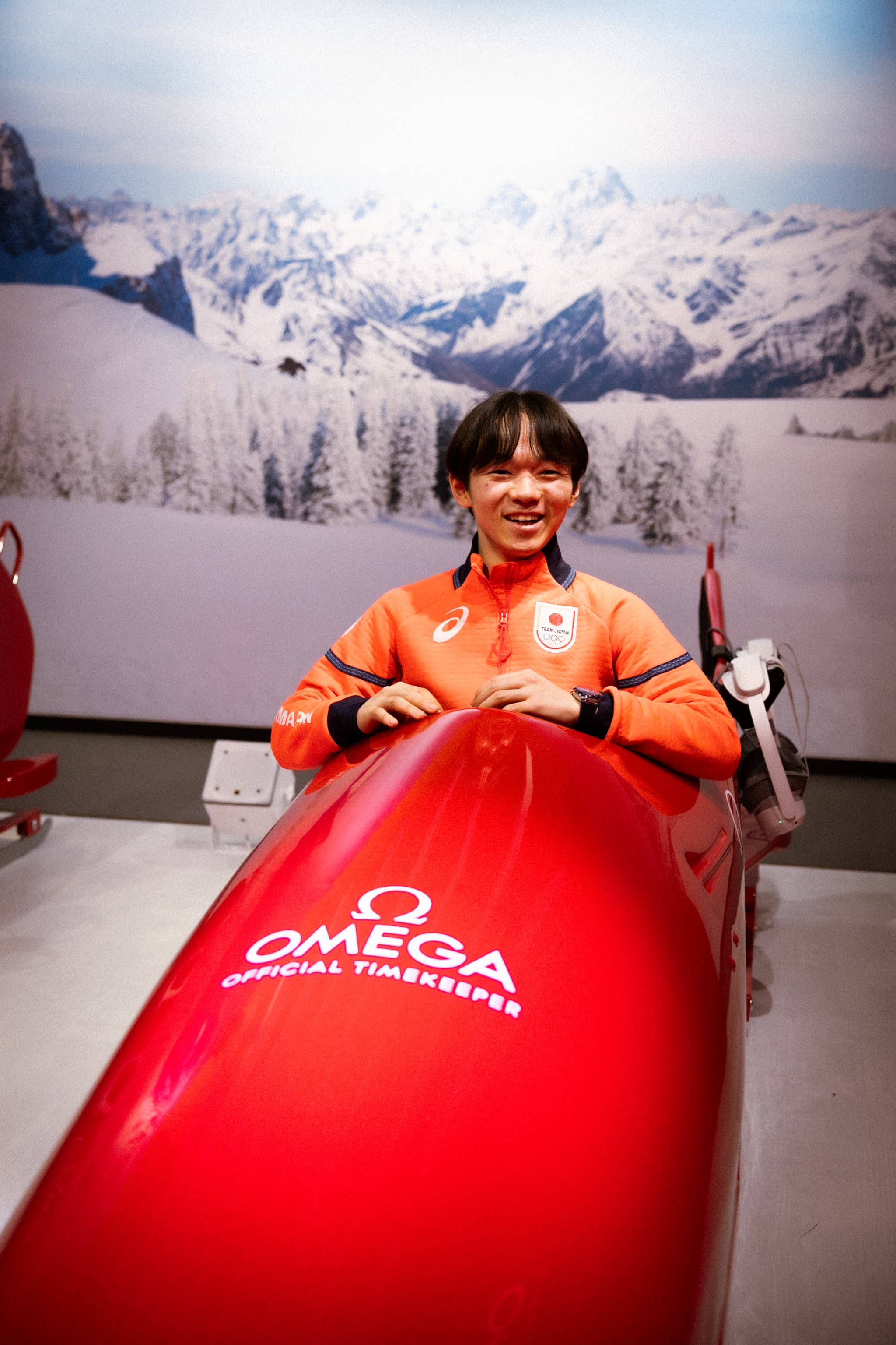 また鍵山選手は、パビリオン内にある実際のボブスレーに乗り込み、VR 体験を初トライ。「VR 体験は初めてで、こんなにリアルに再現されて驚きました!風を感じ、スピード感や動きまで感じたのに、動いてないんですか?!」と、ボブスレーならではのスピードと迫力、そしてオメガの計時技術がいかにしてわずかな瞬間も計測しているかを体感しました。
