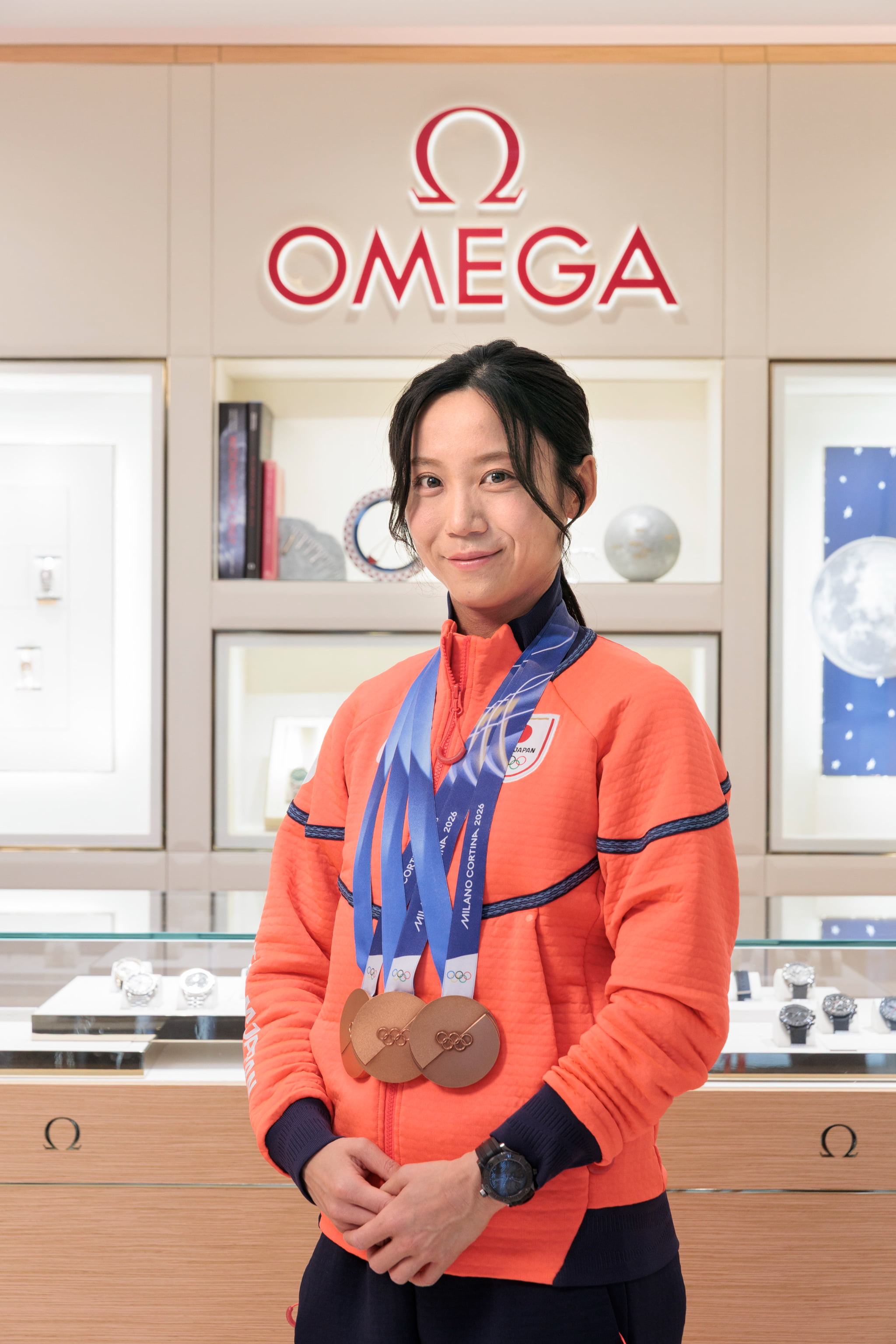 ミラノ・コルティナ 2026 において、髙木選手が女子 1000m、女子 500m、そして女子チーム パシュートにおいて見事獲得した 3 つの銅メダルは、まさに偉業と称すべき輝かしい功績です。 その重みは 3 つのメダルにも象徴されており、オメガは、これらのメダルとともに来場された髙木 選手の快挙を心より称え、祝福いたしました。