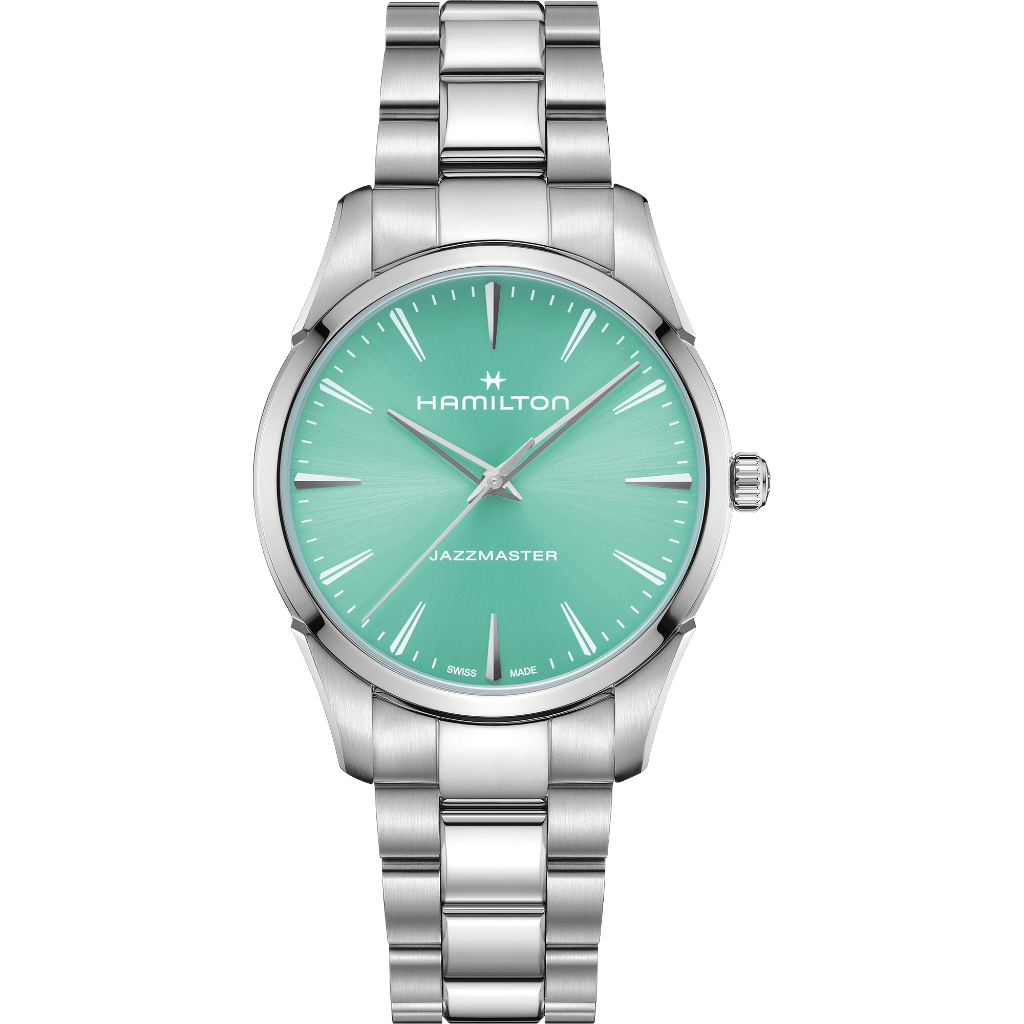 スケルトン加工されたドーフィン針は「ジャズマスター」の伝統を継承しつつ、より軽やかで現代的な表情へと再解釈されています。一方、サンレイ仕上げのダイヤル、アプライドインデックスとプリントインデックスを組み合わせることで、視認性と視覚的なバランスが調和しています。