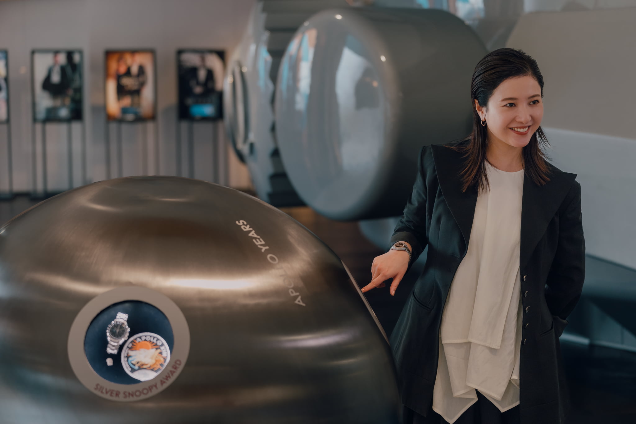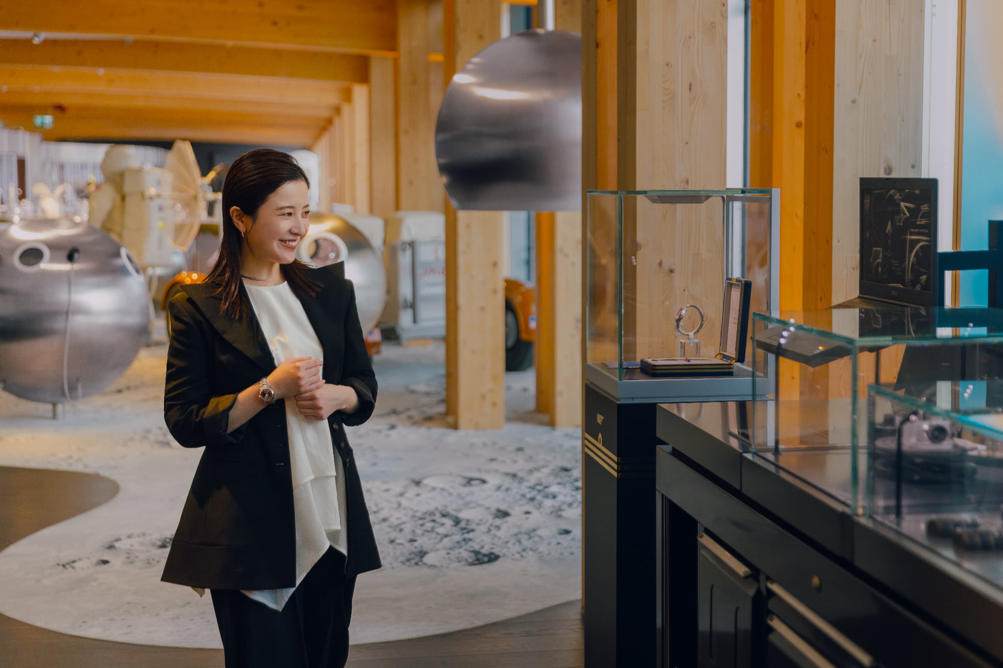 最初に訪れたオメガ ミュージアムには、長い歴史における数々の功績や物語が展示されています。 中でも印象的な “オリンピックエリア”では、オフィシャルタイムキーパーとしての歩みを象徴する 最先端の計時機器が紹介されており、吉高由里子は全長 9m のランニングトラックに設置された スターティングブロックに足をセットし、実際に走ることでオメガの“計時”を体験しました。また “月面エリア”では、アポロ 11 号の月面着陸や 13 号における 14 秒の危機を救った「スピードマス ター ムーンウォッチ」に触れ、歴史的瞬間に寄り添ってきたオメガの存在感を実感。さらには、 レディースウォッチのアーカイブピースを通じて、これまでメンズのイメージが強かったオメガに おける、レディースウォッチメイキングの歴史についても理解を深めました。